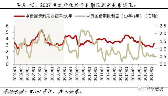 历史上,期限利差的逻辑有一次比较重要的变化,这次变化发生在2007年。在2007年之前,收益率走势和期限利差的走势是同向的,而2007年之后,这个关系开始淡化。
