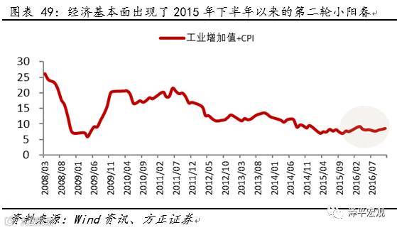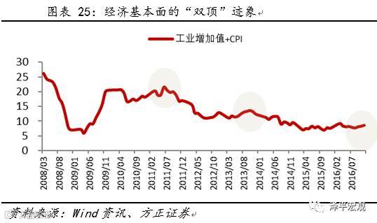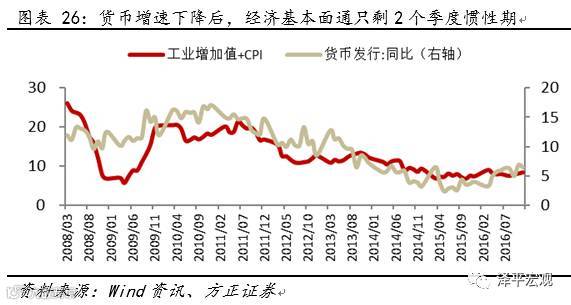 基本面的第二次冲顶一般不会维持太久的时间,因为往往在这个时段货币政策呈收缩的姿态,所以一般来说,当货币发行增速被偏紧的货币政策压下去之后,往往意味着经济基本面(尤其是CPI)只剩下两个季度左右的惯性期,当惯性期一过,经济基本面就会落入下行趋势。