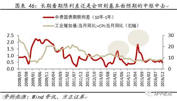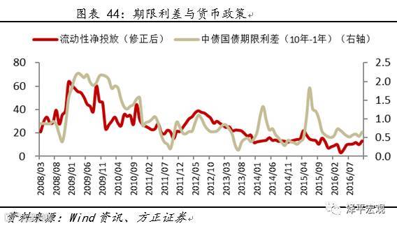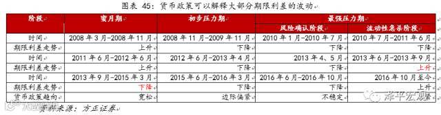 2013年6月-2013年9月、2016年10月至今这两次流动性急杀阶段期限利差和货币政策的趋向相反,更多主导当时期限利差走势的是政策性去杠杆杀风险行为。但这种利差的走阔往往由交易层面的原因带来,从长期来看,期限利差还是会回到基本面预期的中枢中去,而有可能期限利差的均值回归是个缓慢的过程,也会同时扰乱下一阶段的期限利差走势(如2013年9月-2015年3月,就是基本面下行和期限利差回归共同作用在期限利差上,造成了期限利差的走高)。