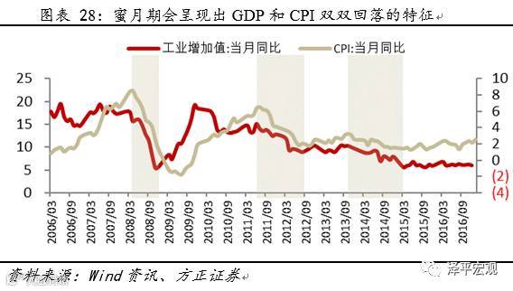 第一阶段为债券市场的蜜月期,这个阶段往往债券市场会表现出最为确定且明显的走牛行情,这个阶段往往会启动于上一轮“流动性的最差期”的结束(货币发行增速回落2个季度之后,一般会以CPI见顶为标志),而结束于GDP出现趋向性改善。在这个期间,一般会呈现出GDP和CPI双双回落的特征。