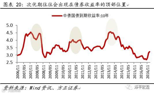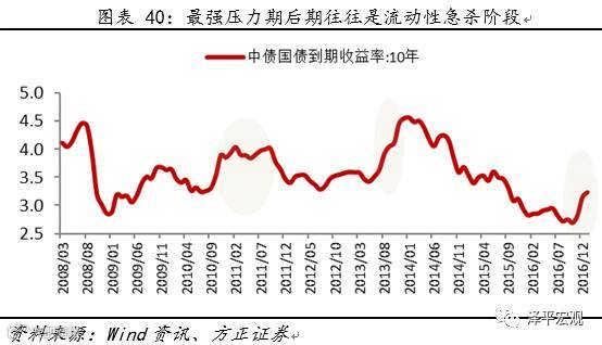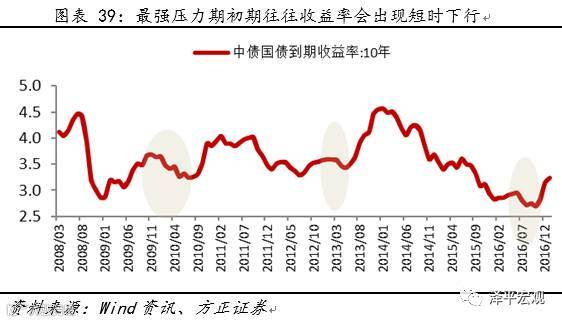 历史上同等的阶段为2008年3月-2008年11月、2011年6月-2012年6月、2013年9月-2015年3月,可以看到在这三个阶段,除却2013年9月-12月,控交易去非标的政策余温致使收益率仍然走高了一小段之外,大部分时间内债券市场收益率是走低的。