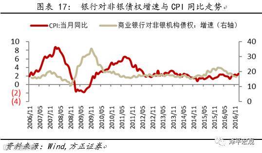 流动性对物价产生的影响不言而喻,正如货币数量方程式所述,流动性大体可分为“M”及“V”两个层次。“M”大多数人会用基础货币来衡量(本文把基础货币中的准备金存款去掉,这些钱已经暂时脱离流通领域,而用“货币发行”这一变量),而“V”我们用商业银行派生货币的速度来衡量(商业银行派生货币相当于某一家的存款剩余可供另一家当期消费),在此我们用商业银行对非银机构债权增速来描述。