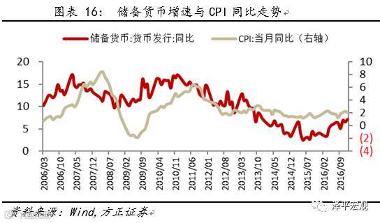 经验上,CPI往往是滞后于“M”和“V”,传导关系大致为“商业银行对非银机构债券增速—货币发行—CPI”,而当这个链条传导到货币发行之后,货币发行和CPI的传导就变得稳定很多,规律上这个传导时滞大概为5-7个月。