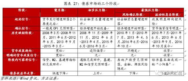 第二个子阶段往往开始于市场和政策开始逐渐意识到在经济退潮后所留下的通胀或金融风险隐患之时,货币政策收紧的信号逐渐开始明确,市场意识到宽松之时尚需等待,于是造成了债券市场最具杀伤力的一轮下跌。2010年7月-2011年6月、2013年6月-2013年9月以及2016年10月至今是这一轮子阶段的历史映射。