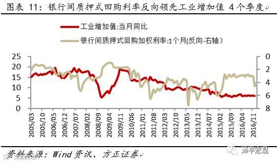 经验上银行间市场利率(以1个月期债券回购利率为例)对工业增加值存在4个季度左右的反向领先关系,当过去4个季度的市场利率呈上升趋势时,未来一段时间的经济增长很可能是向下的,反之,若过去4个季度的市场利率是下降的话,未来一段时间的经济增长很可能是边际改善的。