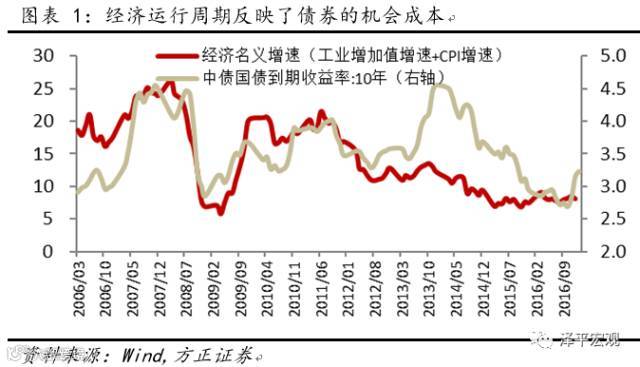 债券收益率本质上就是机会成本,在大多数情况下,债券收益率是与实体经济回报率相关的。一则债券收益率应该与经济增长挂钩(如果债券收益率相对经济增长率明显低估的话,则资金借出者不如拿这些钱来自己经营或做股权投资);二则债券收益率应该与物价走势挂钩(资金借出者要求收益跑赢通货膨胀)。因此,以国债为例,可以看到10年期国债与经济名义增长之间存在很明显的相关性,对经济走势的判断是债券市场行情判断最为核心的部分。