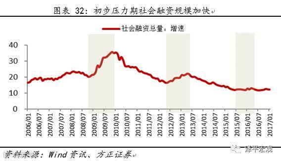 在这段时间内,债券市场在走过最初的蜜月期后,往往会受到一些初步的压力,所以在多数情形下,我们可以观测到受资金需求上升的影响,收益率开始出现一些反弹。在此期间,我们往往会观察到通胀会出现一个见底回升的拐点,而在社会融资规模回落之前,我们同样也能观察到基建和信贷见顶的前兆。