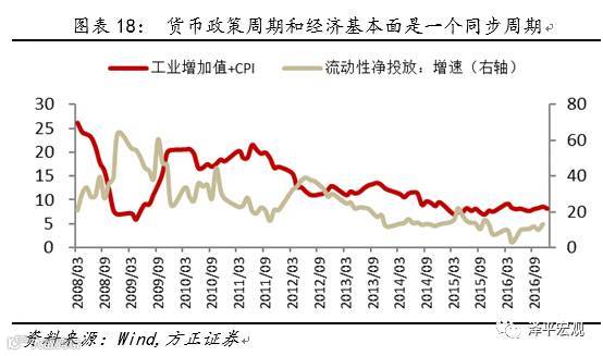 我们暂且把货币政策周期和经济基本面看作一个同步周期。货币政策在流动性净投放上大体维持着逆周期调控的原则(基本面升,流动性则降;基本面降,流动性则升),只有2014年下半年因调结构的需求而致使二者同时下行了5个季度的时间。