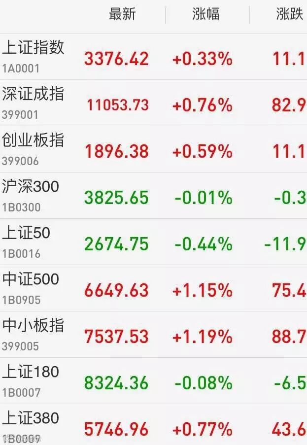 1、A股:上证综指收盘涨0.33%报3376.42点,收复5日均线;深成指涨0.76%报11053.73点;创业板指涨0.59%报1896.38点。两市成交5898亿元,上日为5532亿。