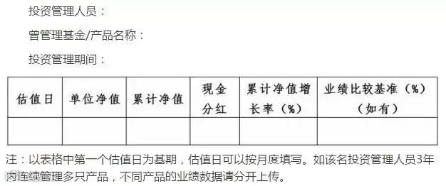 解答:投资管理人员曾管理的基金/产品的投资业绩数据(EXCEL格式)。样表如下: