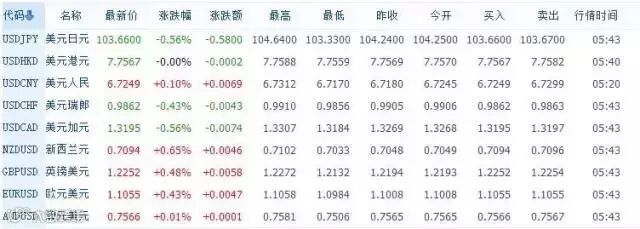 美元指数跌0.45%,报97.5609;欧元兑美元涨0.40%,报1.1051;英镑兑美元涨0.38%,报1.2243;美元兑日元跌0.65%,报103.5820,美元兑人民币涨0.13%,报6.7269。