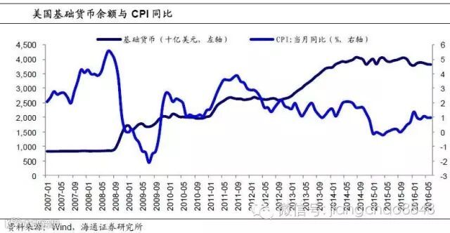 08年金融危机后,美国、日本、欧盟等发达经济体纷纷采取低利率、量化宽松的货币政策,但通胀至今却依然低迷。我们首先看看美国,金融危机后美国以多轮量化宽松刺激经济,稳定金融市场,基础货币从08年时的不足1万亿美元飙升至高点时的4万亿。尽管今年以来美国通胀水平有所回升,但较联储投放的货币量而言,当前依然处于偏低水平,仅为1%。