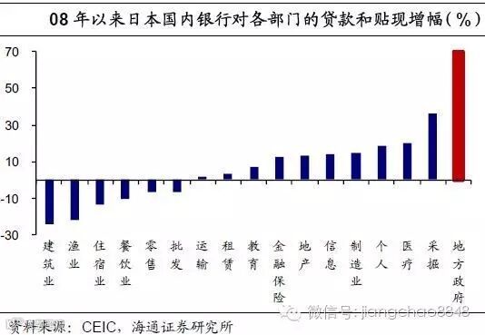 在各发达经济体中,即使是基于基础货币扩张的信用中,政府部门也占据主导,私人部门融资需求偏弱,日本就是典型的代表。从日本央行和存款类金融机构提供的信用结构看,私人部门占比从08年初的71%下降至当前的57%,而政府部门从29%飙升至43%。从日本国内银行提供的贷款和贴现增速看,08年至今,建筑业、住宿、餐饮、批发零售等行业均是萎缩的,金融保险、房地产、信息、制造业、居民贷款累计增速均不足20%,而日本地方政府累计增速高达70%。政府融资高增尽管可以起到逆周期调节的作用,但导致的结果是政府债务负担过重,日本中央政府债务占GDP比重从08年时的153%飙升至当前的209%。