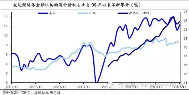 名义利率大降、投资机会有限,发达货币大量外流。在08年金融危机爆发后,欧美日等发达经济体央行大幅下调短期名义利率,资金泛滥导致高息资产迅速被消灭。再加上经济低迷融资需求弱,发达经济体央行印出来的“钞票”大量外流,以寻求其它投资机会。美国金融机构的海外净债权占总债权的比例从09年时的不足1%,上升至15年高点时的14%,欧元区的这一比例从09年时的15%上升至当前的25%,日本从6%升至9%。