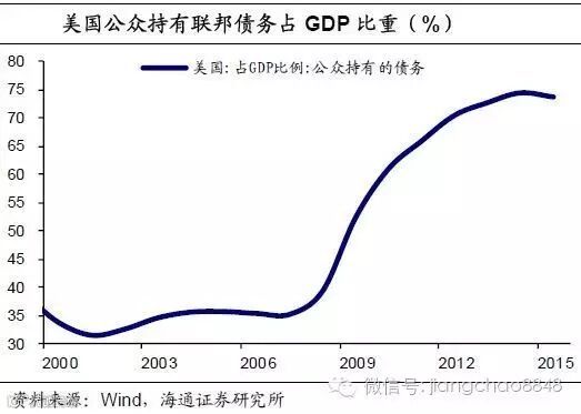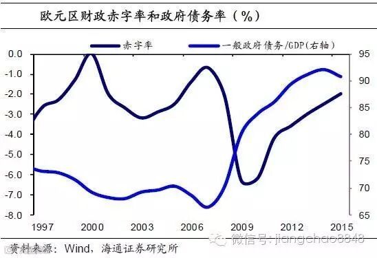 美国和欧元区政府部门的信用扩张速度同样飞快,而私人部门融资需求低迷。08年以来,美国金融机构对私人部门债权占比从87%降至低点时的78%,而对政府部门从13%升至高点时的22%,导致中央政府债务占GDP比重从08年之前的56%左右飙升至14年的98%。近两年随着美国经济缓慢复苏,私人部门融资需求有所增长,政府融资占比才开始回落。欧元区金融机构对政府部门债权占比也从09年时的26%飙升至15年底的33%,政府债务率也大幅飙升。