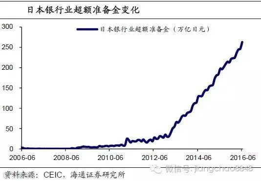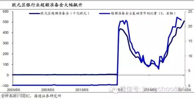 再看一下日本和美国的情况,基本上也在演绎着类似的故事。自13年以来,日本银行业超额准备金从不足70万亿日元,飙升至当前的263万亿,日本央行增加的基础货币中有86%是以超额准备金的形式存在,继续留在了央行手里。而且日本同样实施负利率政策,对银行利润构成挤压。美国银行业的超额准备金从08年的不足20亿美元飙升至当前的2.2万亿美元,新增基础货币中的75%是以超额准备金的形式存在。