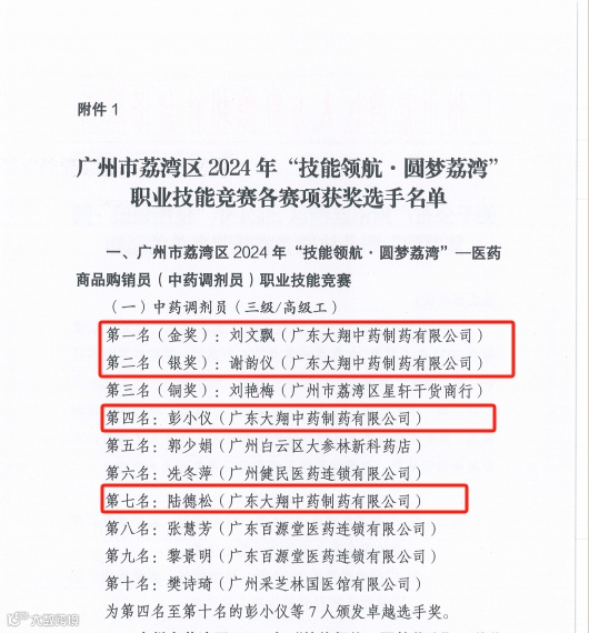 在2024年“技能领航 圆梦荔湾”——医药商品购销员(中药调剂员职业技能竞赛中,广东大翔中药制药有限公司员工刘文飘凭借精湛的技能和出色的表现,荣获金奖;谢韵仪荣获银奖;彭小仪、陆德松荣获卓越选手奖。这些荣誉的获得,充分展示了大翔中药在中药制药领域的人才培养和技能提升方面的显著成果。