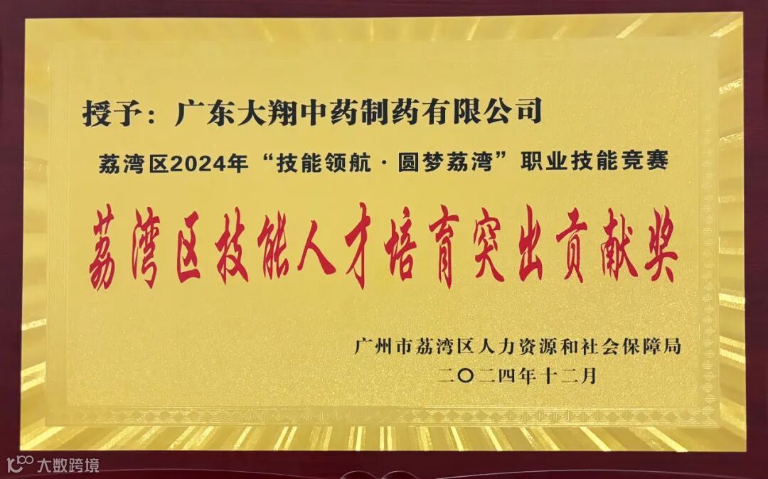 此外,广东大翔中药制药有限公司还荣获了“广州市荔湾区技能人才培育突出贡献奖”。这一奖项的获得,是对广东大翔中药制药有限公司在技能人才培育方面所做出的努力和贡献的高度认可。