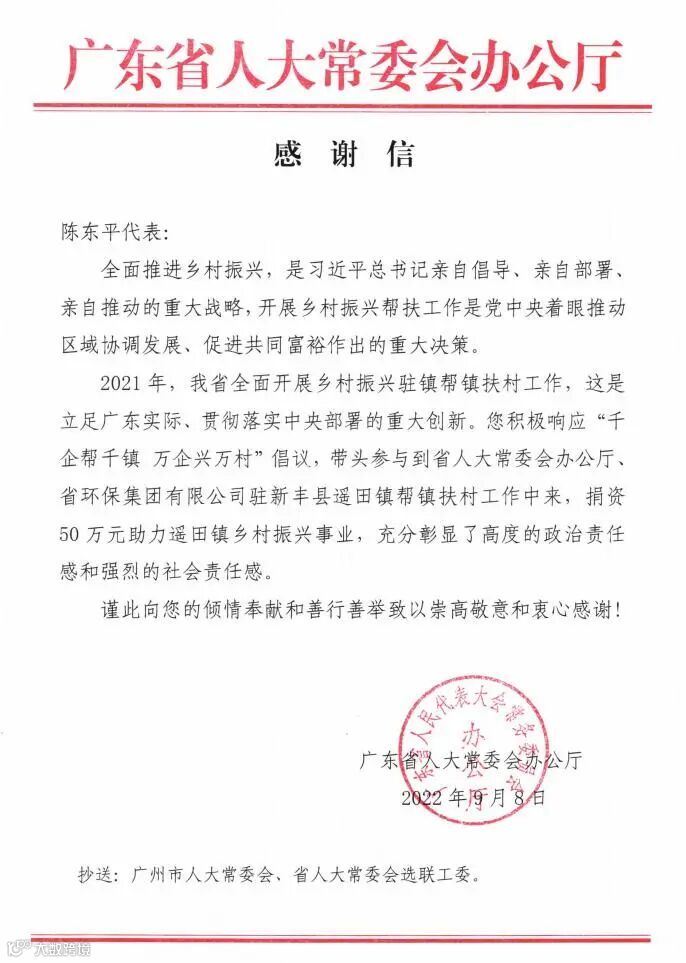 近日,广东省人大常委会办公厅向省人大代表、大翔集团董事长陈东平发来感谢信,对他积极响应广东省“千企帮千镇 万企兴万村”的倡议,带头参与“帮镇扶村”工作,捐资助力遥田镇乡村振兴事业表示感谢,称赞他“充分彰显了高度的政治责任感和强烈的社会责任感”。