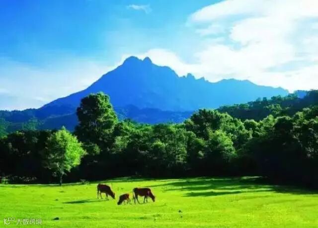 只见林木苍翠,白云缭绕,