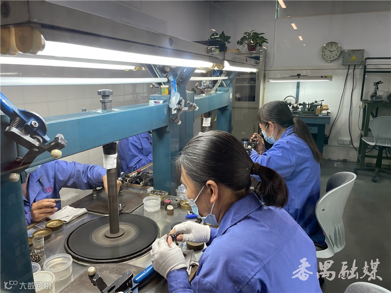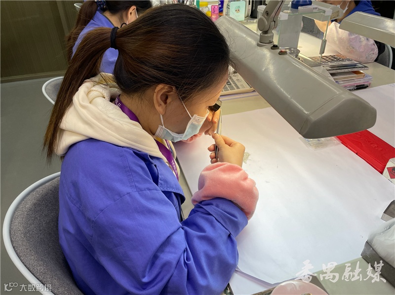 在沙湾珠宝产业园可以看到,门岗保安查验健康码后便放行了。在相关工作人员的带领下,进入到广州市亿钻珠宝有限公司的生产车间,只见注蜡、放料、融金、剪金等各工序车间里,工人们戴着口罩专心致志、有条不紊地开展工作。