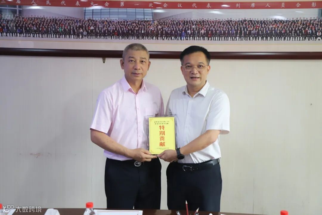 2024年8月6日,荔湾区人民政府副区长叶辉等领导莅临大翔集团调研指导。会上,为感谢大翔集团过去一年中对“荔湾区2023年6·30助力乡村振兴活动”的支持,荔湾区人民政府副区长叶辉为大翔集团董事长陈东平颁发了荔湾区2023年6·30助力乡村振兴活动特别贡献奖。