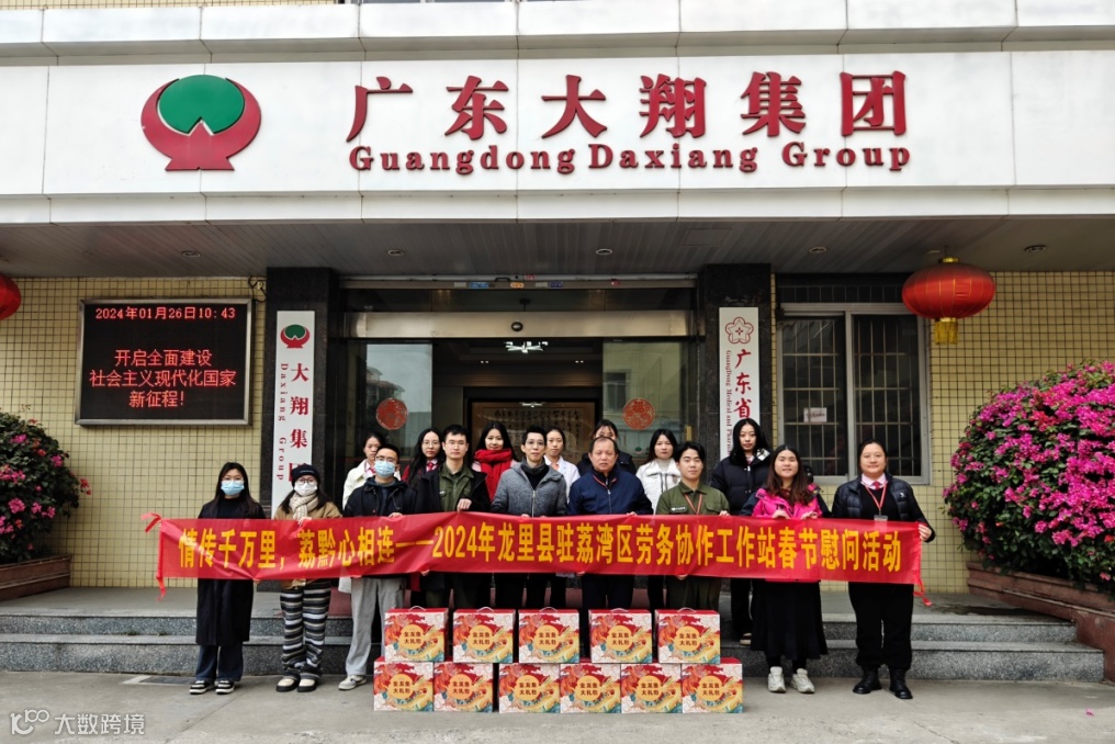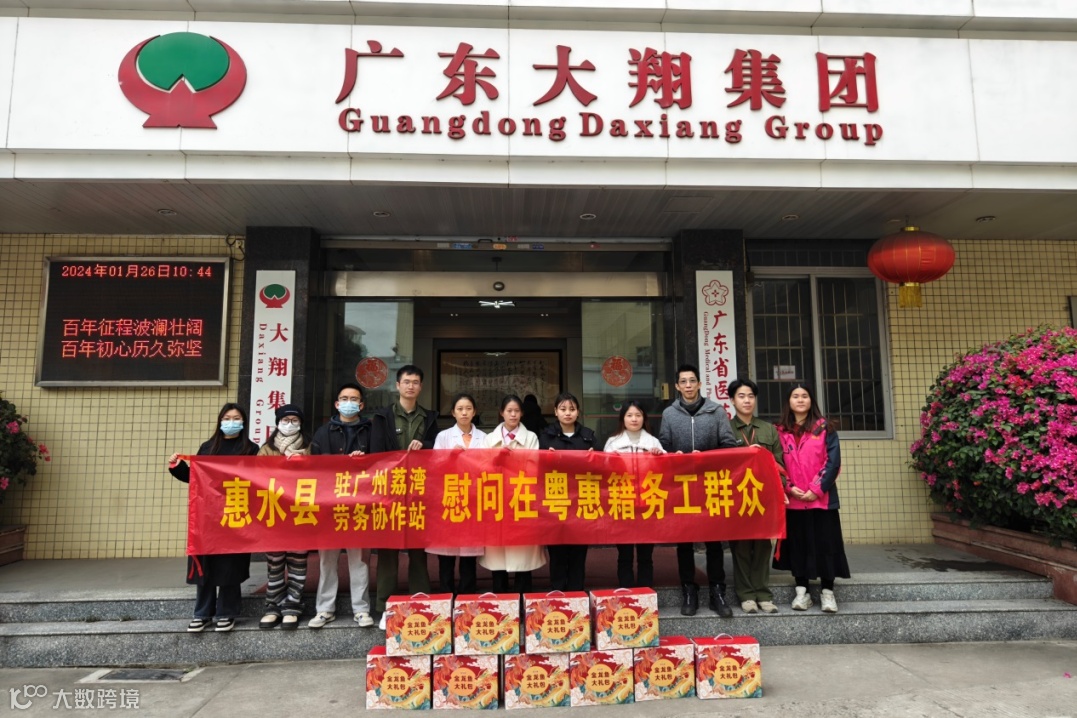 1月26日龙里、惠水驻广州荔湾劳务协作站工作人员一行来到大翔医药集团慰问在粤贵籍务工群众。此次活动拉近家乡与异地的距离,分享在粤贵籍务工群众的喜怒哀乐,让他们感受到家乡的关怀和温暖。在慰问活动中,荔湾劳务协作站为贵籍务工群众精心准备了大礼包,以及扶贫政策咨询、补贴申领等多项服务,让务工群众在繁忙的工作之余感受到了浓浓的家乡情怀。
