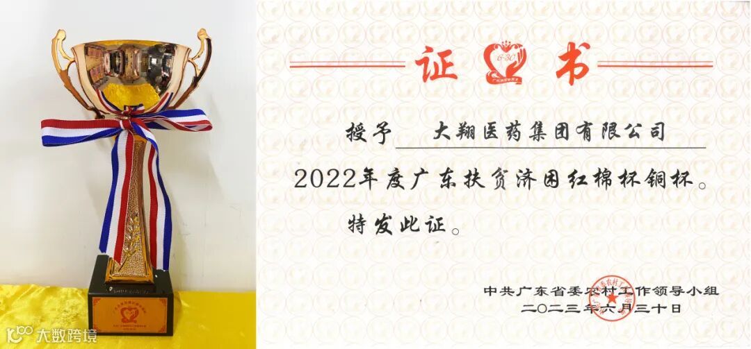 2023年7月,广州市2023年“6·30”助力乡村振兴活动仪式在广州举行。会上,大翔集团认捐100万元,为广东省全面推进乡村振兴贡献绵薄之力,并荣获“2022年度广东扶贫济困红棉杯铜杯”的荣誉。