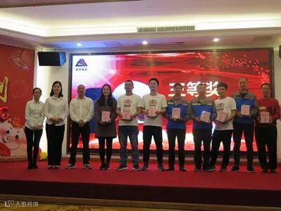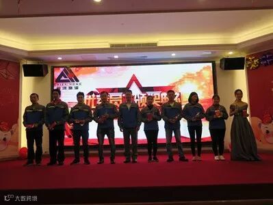 享受着美食的同时,主持人引领我们进入2018年度优秀员工的表彰环节,2018年9名优秀员工,带着荣誉和荣耀在感恩中接过董事长林国通先生亲自颁发的奖杯和奖金,运输及配送部朱泳烨代表2018年优秀员工作了获奖感言。