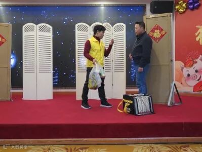 之后行政人事部曾茜榆为我们带来一段韩国热舞《BBoom Bboom》,动感的音乐、劲爆的舞姿,真是地表最强啊;随后仓储部项目经理许豪杰带着我们进入神秘的魔术世界,今年的魔术甚是精彩,大变活人的魔术果真让现场观众大开眼界,大家伙看得意犹未尽,惊讶万分。紧接着我们完成了“众人穿衣”的互动游戏,参赛的2支队伍经过激励的比拼之后红队领先获得胜利。接下来仓储部同事为我们带来了小品《当外卖来敲门》,同事们的精彩表演给观众带来了许多的欢乐,“外卖小哥”雷仁义搞笑、逗趣、专业的演技把外卖小哥的真实写照演绎得淋漓尽致。