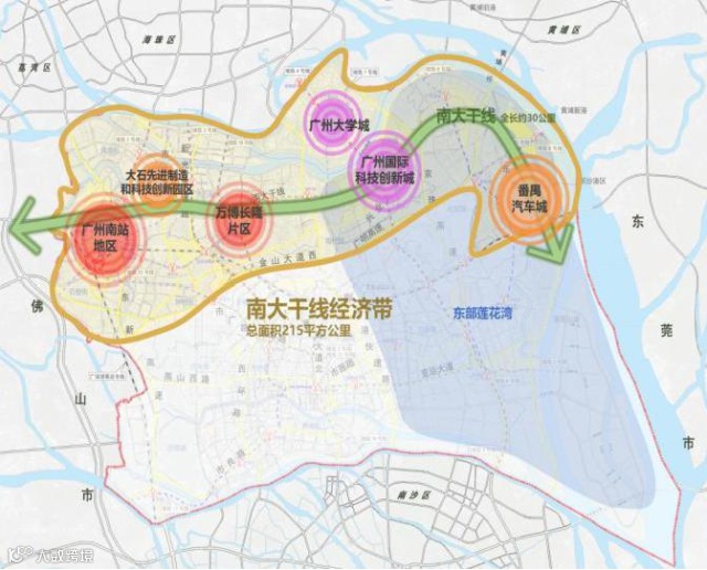 “十三五”期间,番禺区以南大干线这一主轴,串联起广州南站地区、万博长隆片区、大石先进制造和科技创新园区、广州国际科技创新城、广州大学城、番禺经济技术开发区、东部莲花湾七个重大平台,南大干线经济带“一轴七平台”发展格局初步形成。