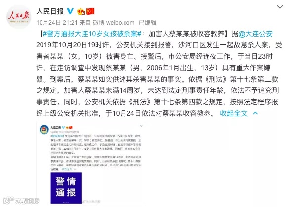 2019年10月20日,13岁大连男孩蔡某试图强奸同小区的10岁女孩,遭拒后将其杀害,并抛尸灌木林。因男孩未满14岁,警方依法不追究刑事责任,对其收容教养3年。开庭当天,被告蔡某的家属无一人出庭,而且在判决书下来的几个月后,蔡某父母既无公开道歉,也没有任何实际赔偿。