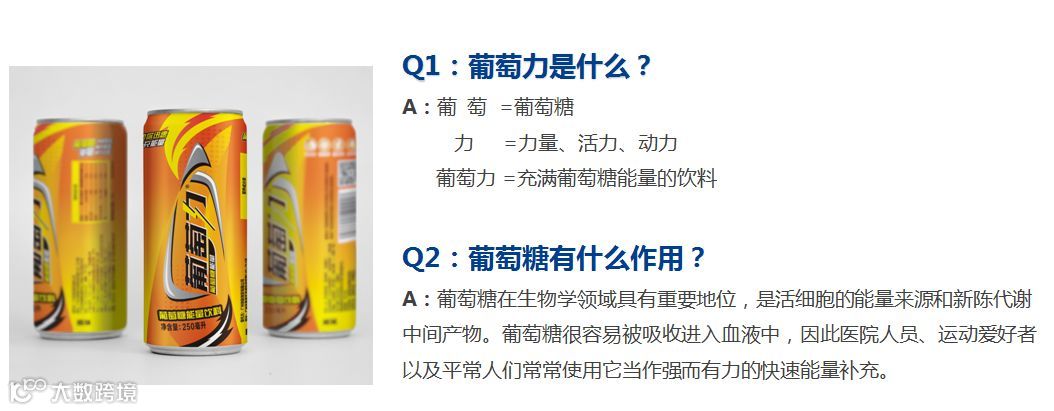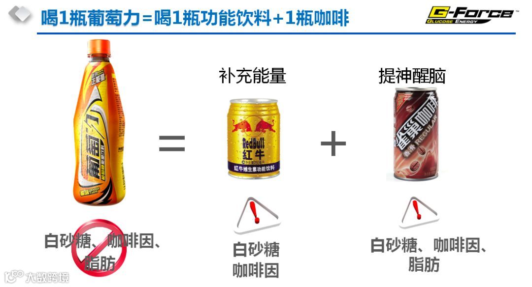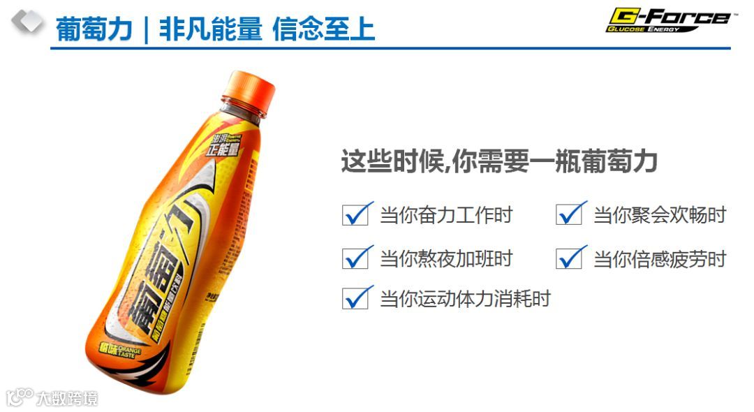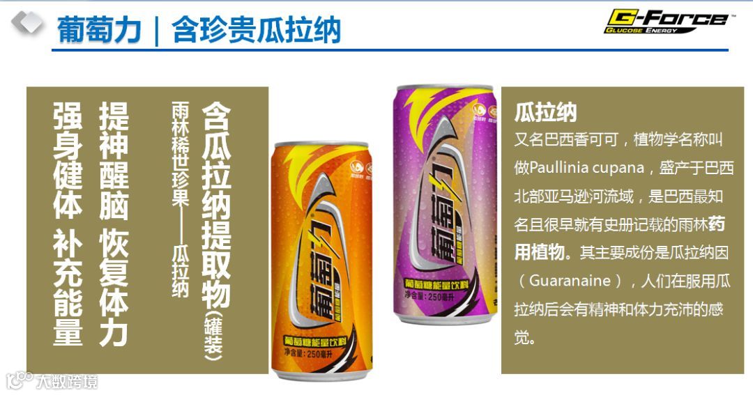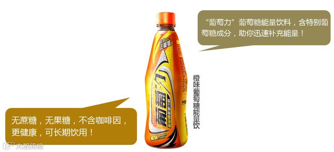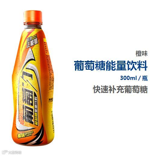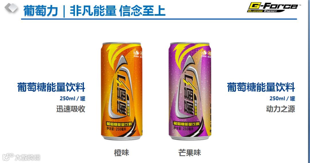 由快联集团研发的“葡萄力”饮料有2种规格,300ml的玻璃瓶装橙味葡萄糖能量饮料以及250ml的易拉罐装橙味/芒果味葡萄糖能量饮料。
