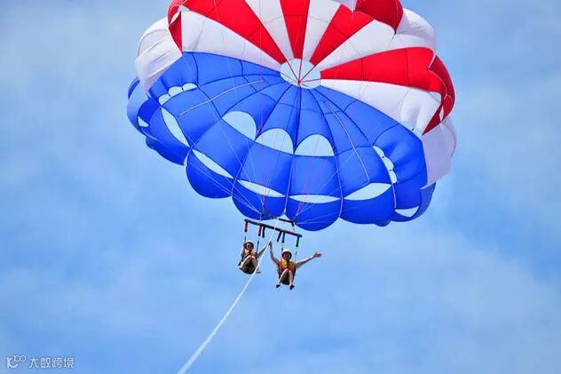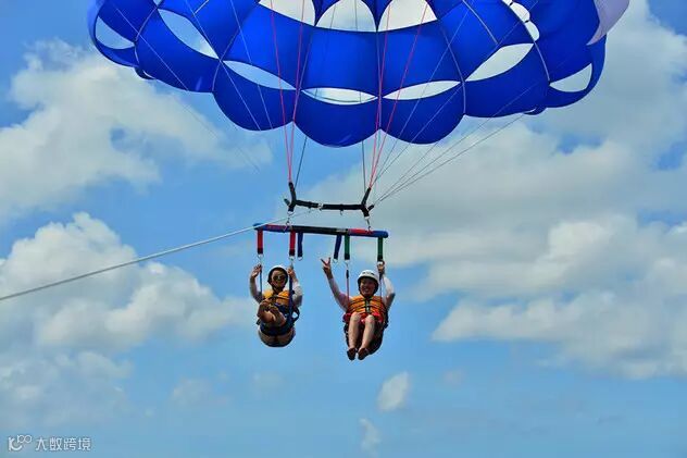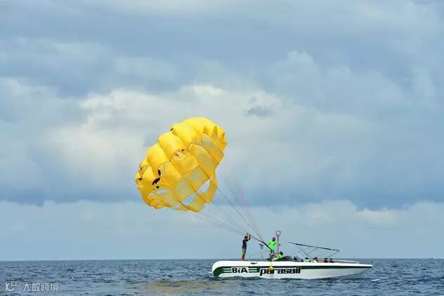 长滩岛有很多水上活动,快艇拖曳降落伞是比较刺激而有趣的项目。报名该项目后,商家会用快艇把游客先运送到海上的平台上,在那里接受培训和签订“生死状”,才可以起飞翱翔在蓝天里。