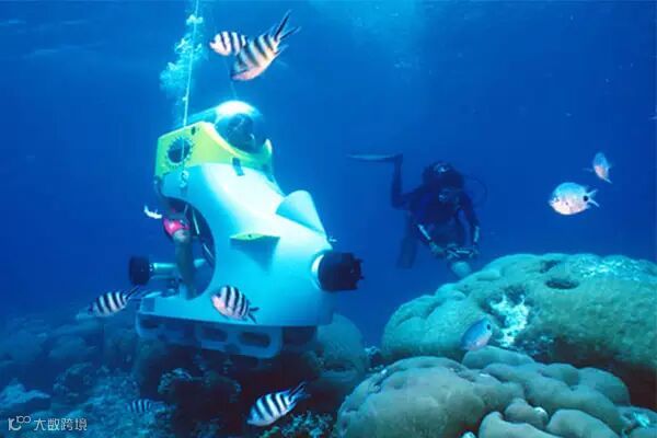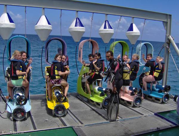 一项冒险而又刺激的水下活动,当你坐在摩托车上时,脑袋就置于一个像太空行走时的头盔内,里面可以自由的呼吸氧气。有了它,你可以不需要带任何面镜或者调节器就可以进行水下活动,以180度的视野饱览水下风光,仔细欣赏海底的珊瑚和鱼群,可以在海底尽情的享受来自小动物们的亲密接触。