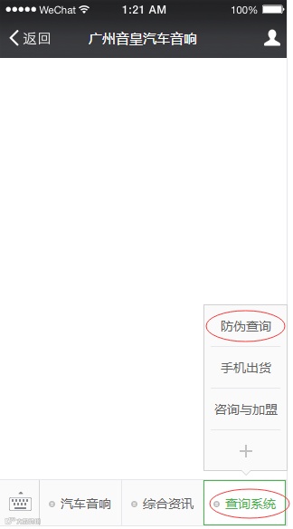 第三步:进入”广州音皇汽车音响“微信公众号自定义菜单——查询系统——防伪查询,即可扫描您所购买的产品上的二维码对产品真伪进行鉴别。