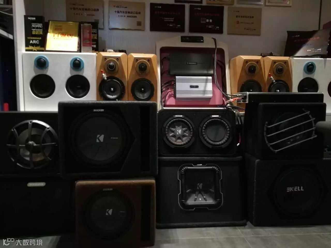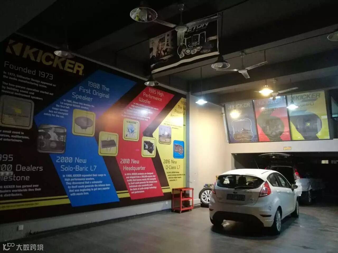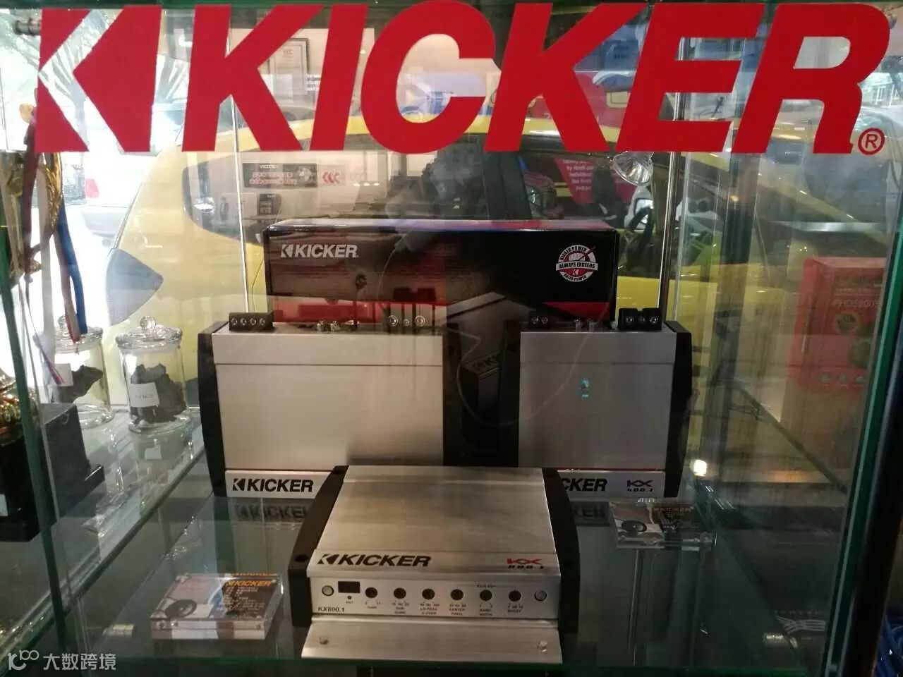 厦门音乐车坊重新设计布置的店内摆设,KICKER产品按黄、红、蓝不同等级摆放,让消费者更了解KICKER产品的系列