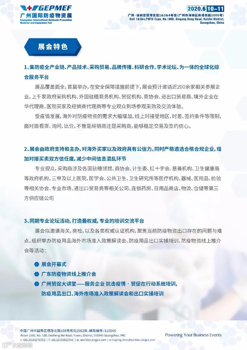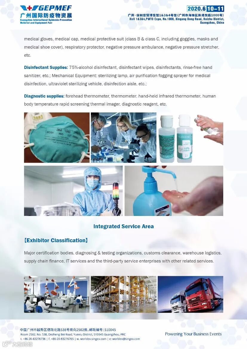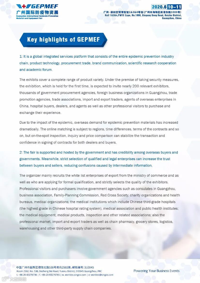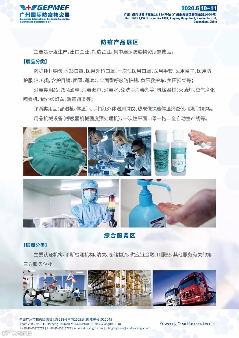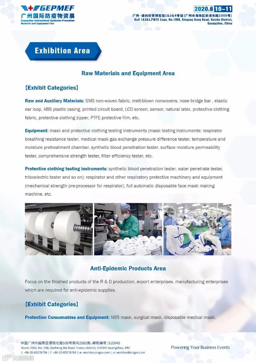 此次展览会是国内首个防疫物资线下专业展,同时也是新冠疫情后在广州举办的首个专业性展览会。展会展览面积达36,000平方米,将开设设备展区、防疫产品展区、原材料展区和综合服务区四大主题展区,提供安全、合规的防疫全产业链产品及最新技术展示,同期配套防疫物资出口相关的政策宣讲、网红带货、直播对接等线上线下相结合的活动。展会参展企业均经过严格遴选,包括原材料、生产机器、产品辅料配件、产品成品以及第三方服务企业等,展品种类和服务一应俱全,品质优良,是我国防疫物资产品的首次专业、可信、高端展会。