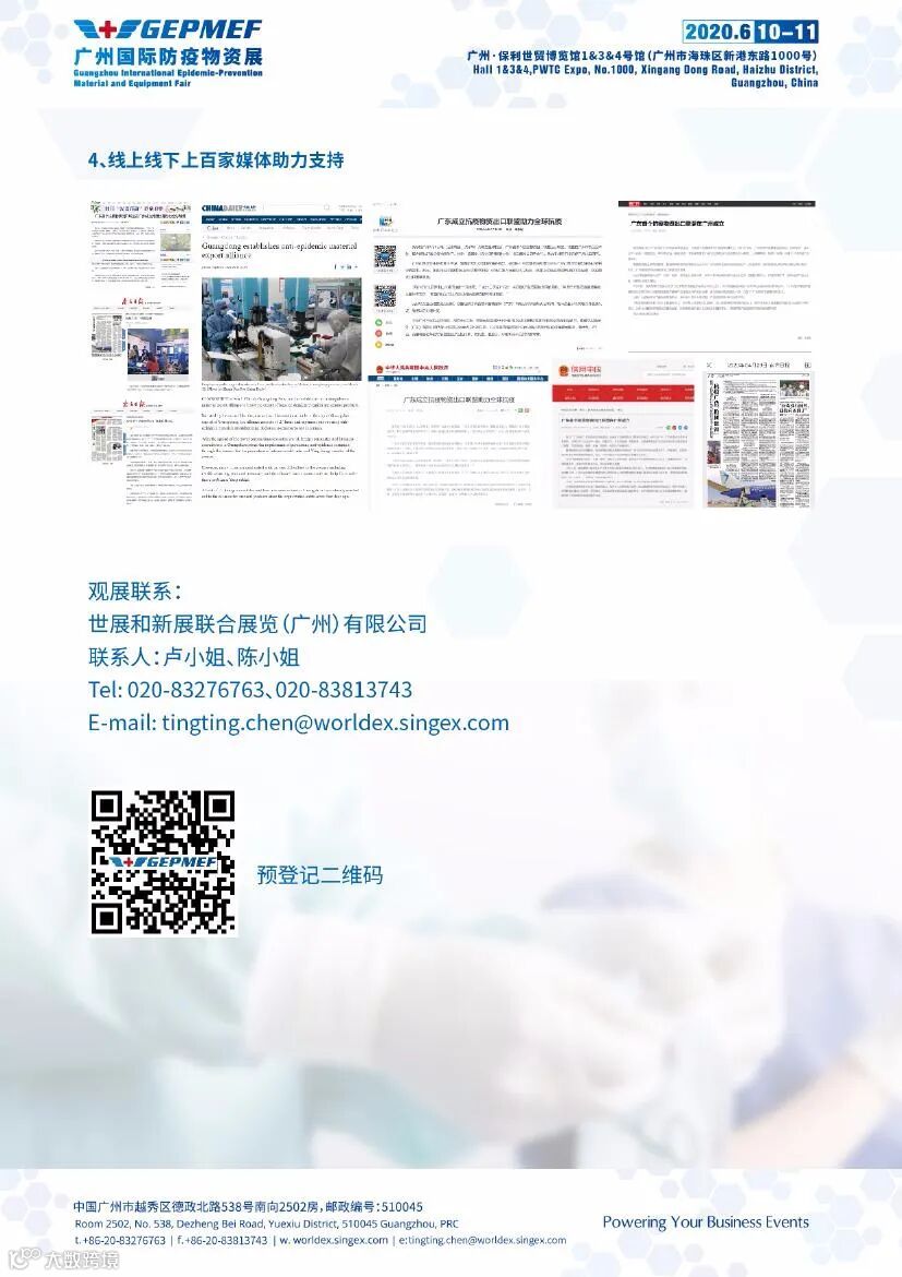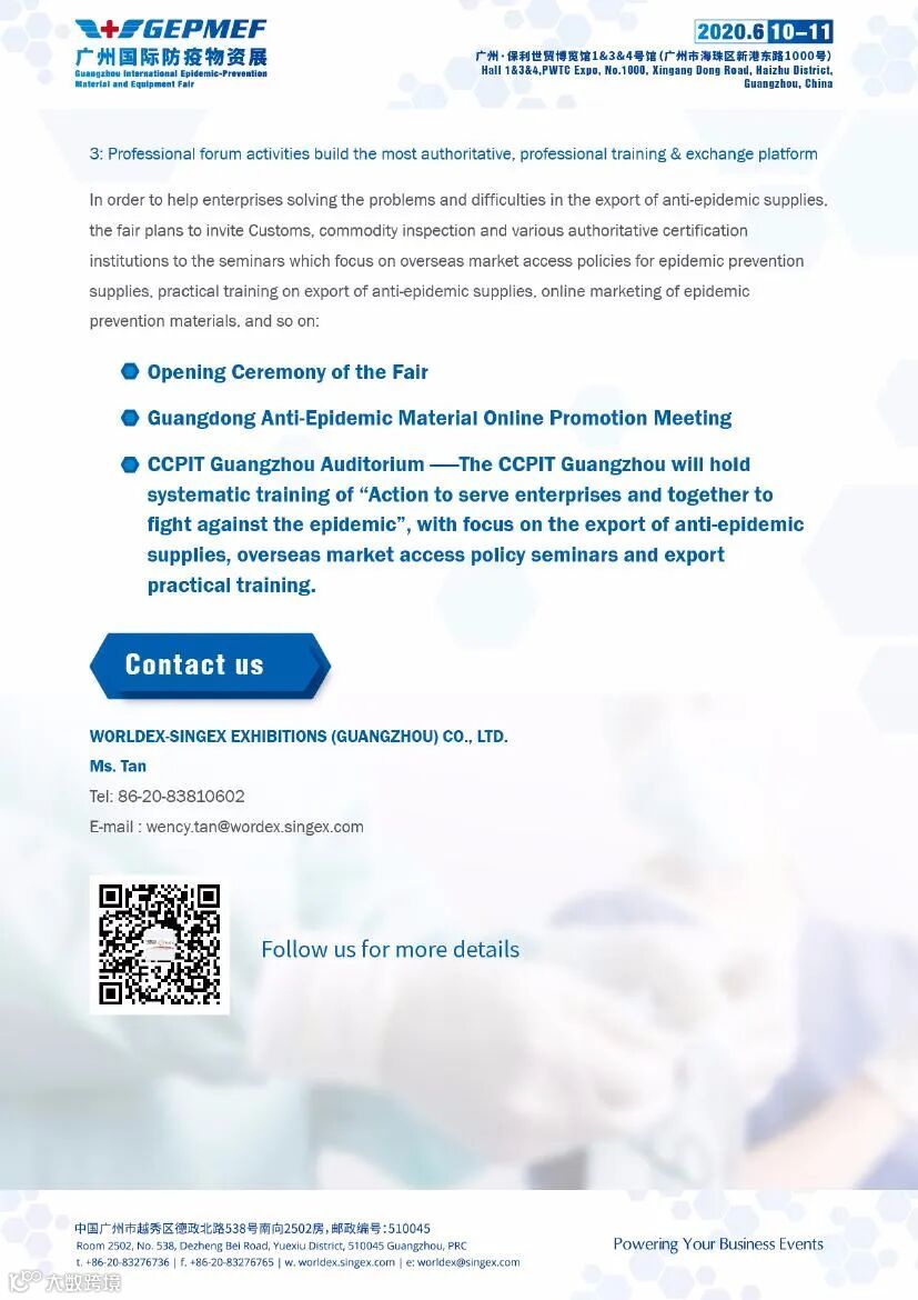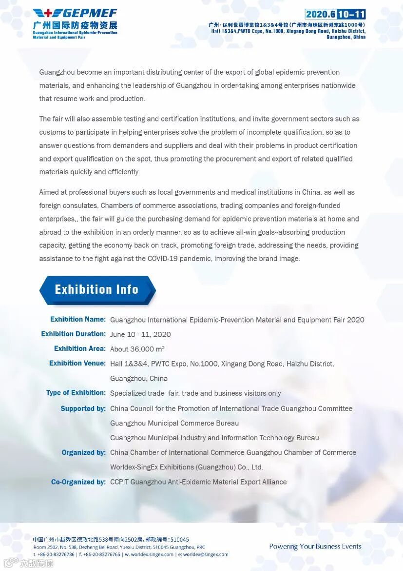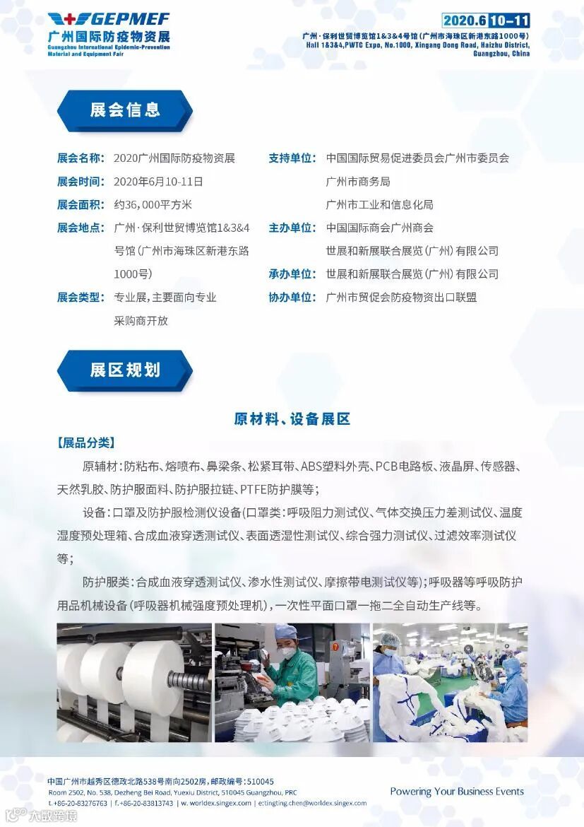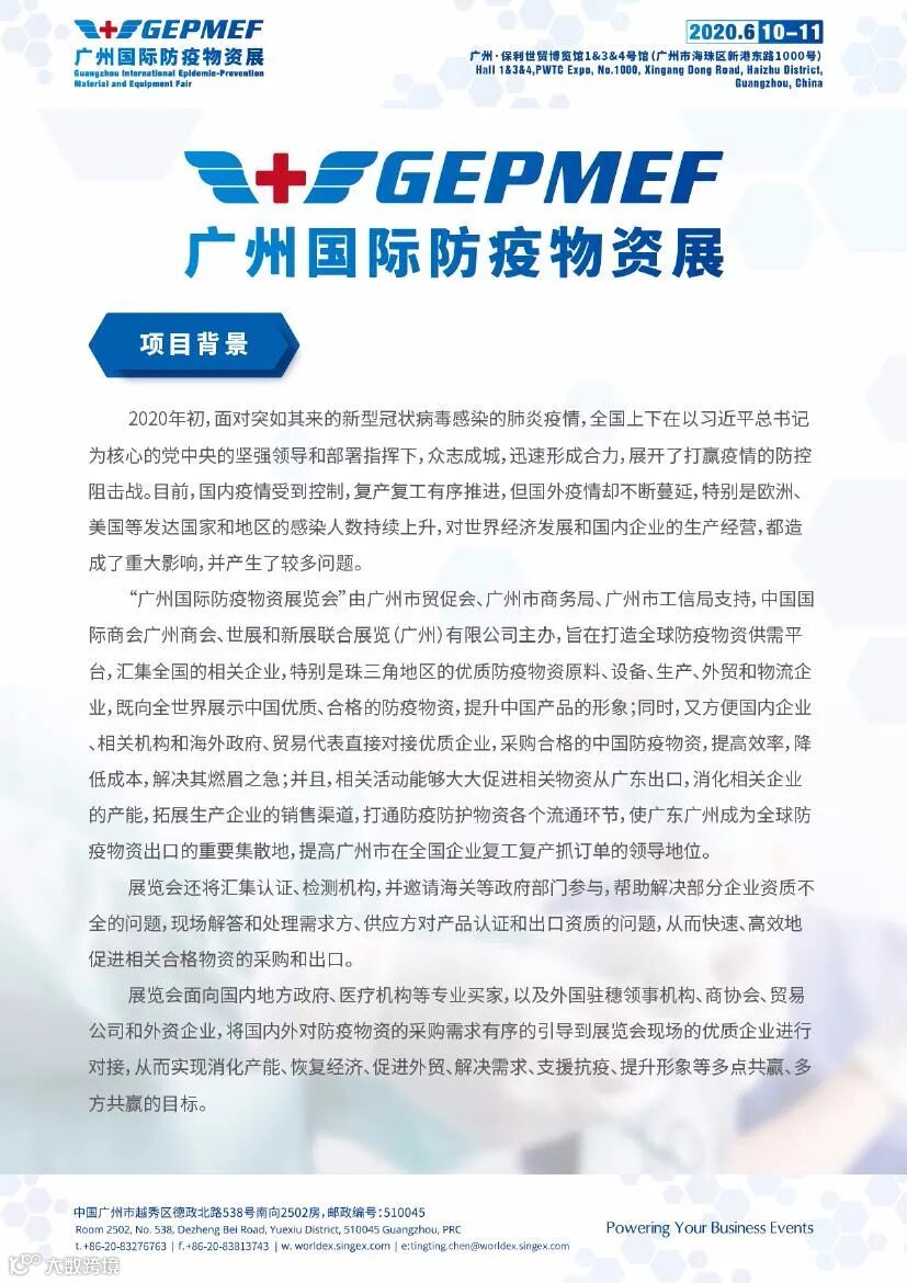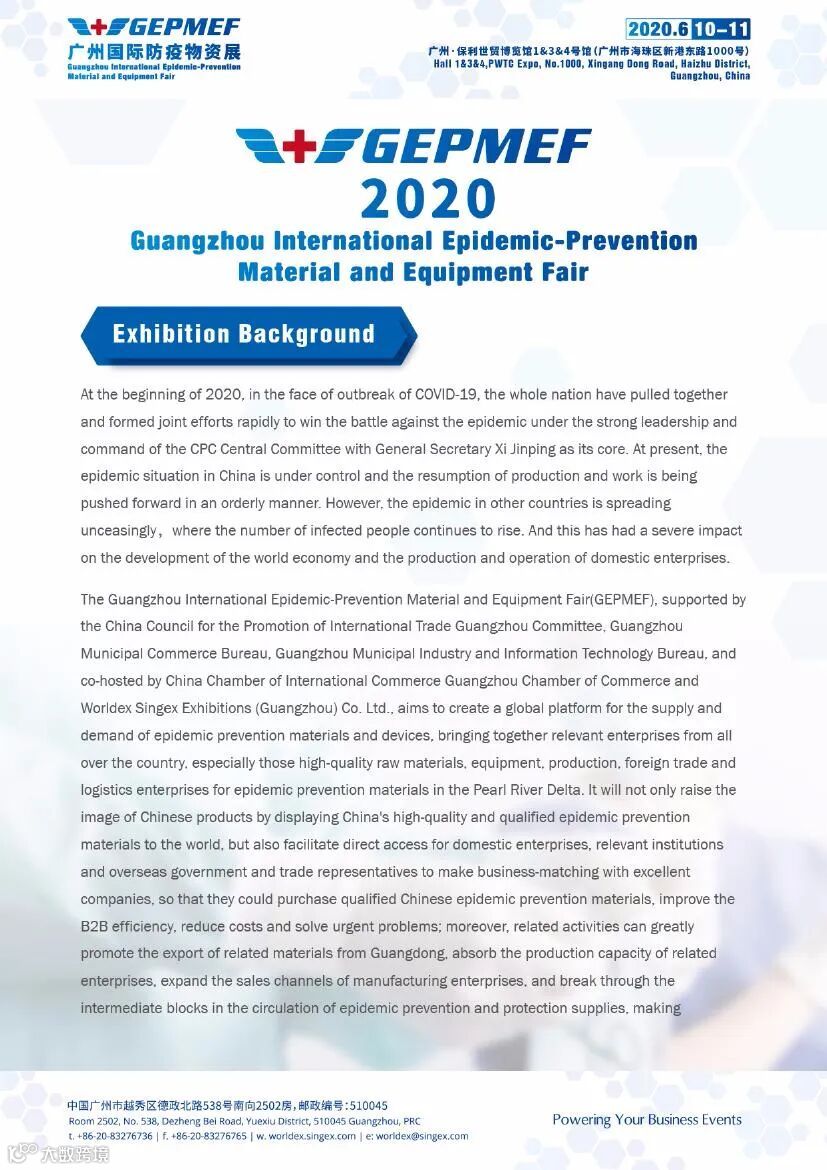 为贯彻落实习近平总书记关于夺取疫情防控和经济社会发展“双胜利”的重要指示精神,根据市委、市政府关于做好“六稳”“六保”的工作要求,由广州市贸促会、广州市商务局、广州市工业和信息化局支持,广州国际商会、世展和新展联合展览(广州)有限公司共同主办的“2020年广州国际防疫物资展览会”定于2020年6月10-11日在广州琶洲保利世贸博览馆举办。