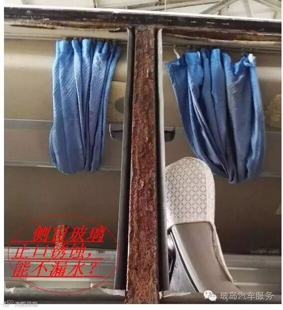 综上所述:客车生产厂家技术参差不齐,加上南方雨水多又靠近大海,沙板极易锈蚀,玻璃漏水是常态,只有早发现、早处理,特别是找专业维修厂对症下药,才不至于扩大损失(地板霉烂、内饰损坏),乃至影响营运。