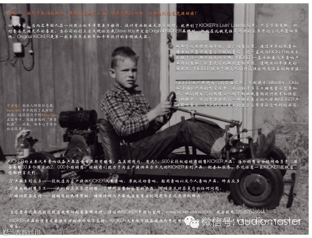 早在70年代,年轻的美国人Steve Irby对音乐和摇滚球队十分着迷。在当时红得发紫的"The Beatles"甲壳虫)乐队被无数乐迷追逐倾倒,Steve Irby就是其中之一。他也想像乐队成员一样拥有一把吉他,于是向父亲请求买一把作为礼物,可父亲却给了他一个更好的建议:与其买,不如亲自动手制作。从那时起,Steve Irby便与制做那些能够发出声音的东西的工件结下了不解之缘。1973年,在美国俄克拉荷马州的Stillwater Designs,创业时公司只有两个人,一间破旧的车库既是办公室又是设计车间。所有产品全是在这里凭双手敲敲打打制造而成的,而且仅仅生产很少数量的教堂、礼堂、乐队使用的扩音器和家庭音响。后来Steve Irby,开始尝试将体积庞大的音箱搬到汽车上,装置于在美国任何地方都可以看到的pickup(皮卡) 车座椅后背部。播放音乐时,整个座椅和音箱迸发出有节奏的震颤,乘着感觉就像有人在踢(kick)自己的后背。"KICKER",由此得名。
