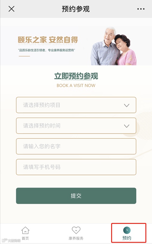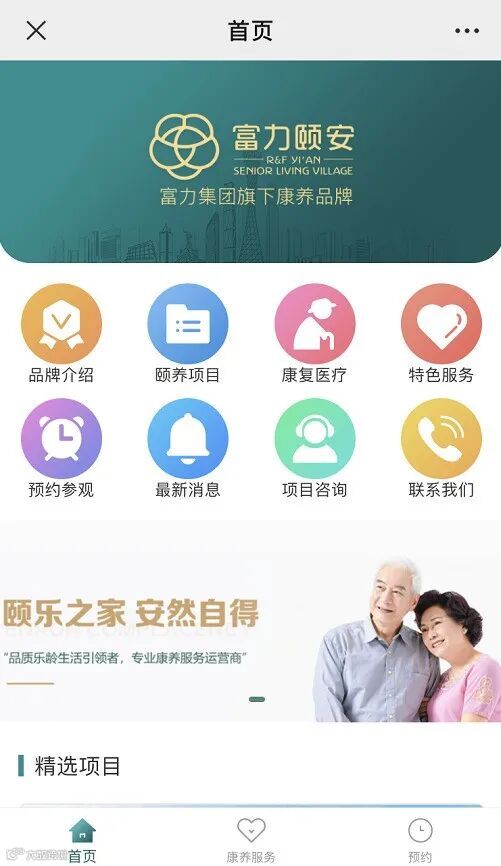 品牌介绍、颐养项目、康复医疗、特色服务、预约参观、最新消息、项目咨询、联系我们等功能栏目。