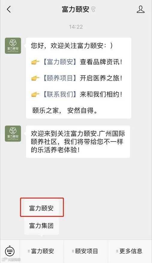 “富力颐安”公众号→点击“富力颐安”菜单→【富力颐安】官微首页。