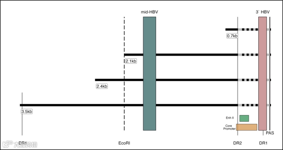 来自肝脏组织的含人类 - 病毒嵌合断点的转录图谱。彩色方框表示两个数字滴度聚合酶链反应(ddPCR)目标扩增子:乙肝病毒(HBV)中部片段和乙肝病毒 3' 端片段。