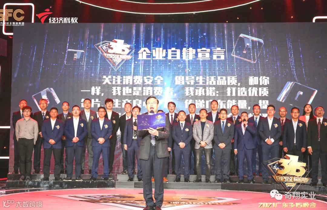 守护安全,畅通消费。2021年3月14日晚,“2021广东3.15晚会”如期上演。本次晚会从嚼槟榔是否会致口腔癌,美容贷,人脸支付安全,特斯拉维权,问题电缆等与民生息息相关的消费问题进行深入报道。作为致力于保护消费者权益的积极代表,风扇领军企业广州奇翔董事长石建国先生受邀出席晚会,并与加多宝,喜茶,健力宝等30多家企业共同在晚会上宣读企业自律宣言,表达了对全体消费者的负责,共筑健康消费环境的承诺。与政府、媒体一道共同关注消费安全,捍卫消费者权益,传递广东正能量。
