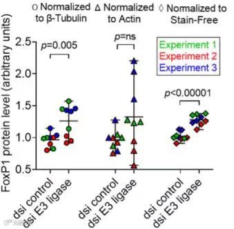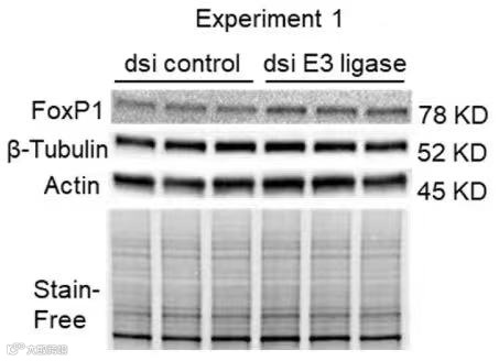 例如使用 Stain-Free 总蛋白为内参,我们可以得出非常明确的结论:FoxP1 表达量会上调,符合理论预期