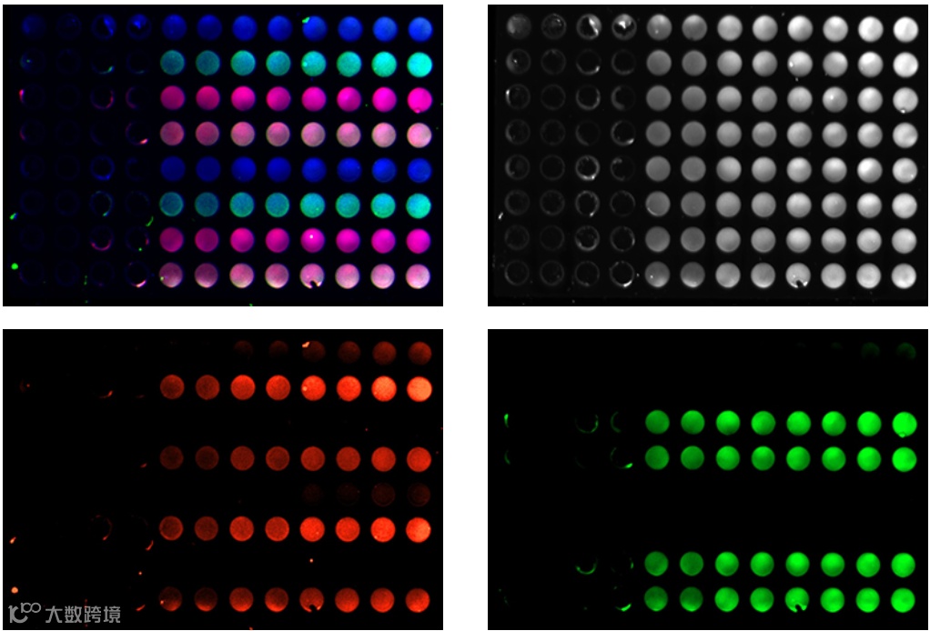 通常的ICW的实验结果如下图:将 HEK293 细胞以 5k、10k、25k、50k、75k 和 100k 细胞/孔接种在重复的column中,靶蛋白为 Gamma(DyLight 680,红色)、p53(DyLight 800,绿色)和 看家蛋白 GAPDH(罗丹明,灰色)。