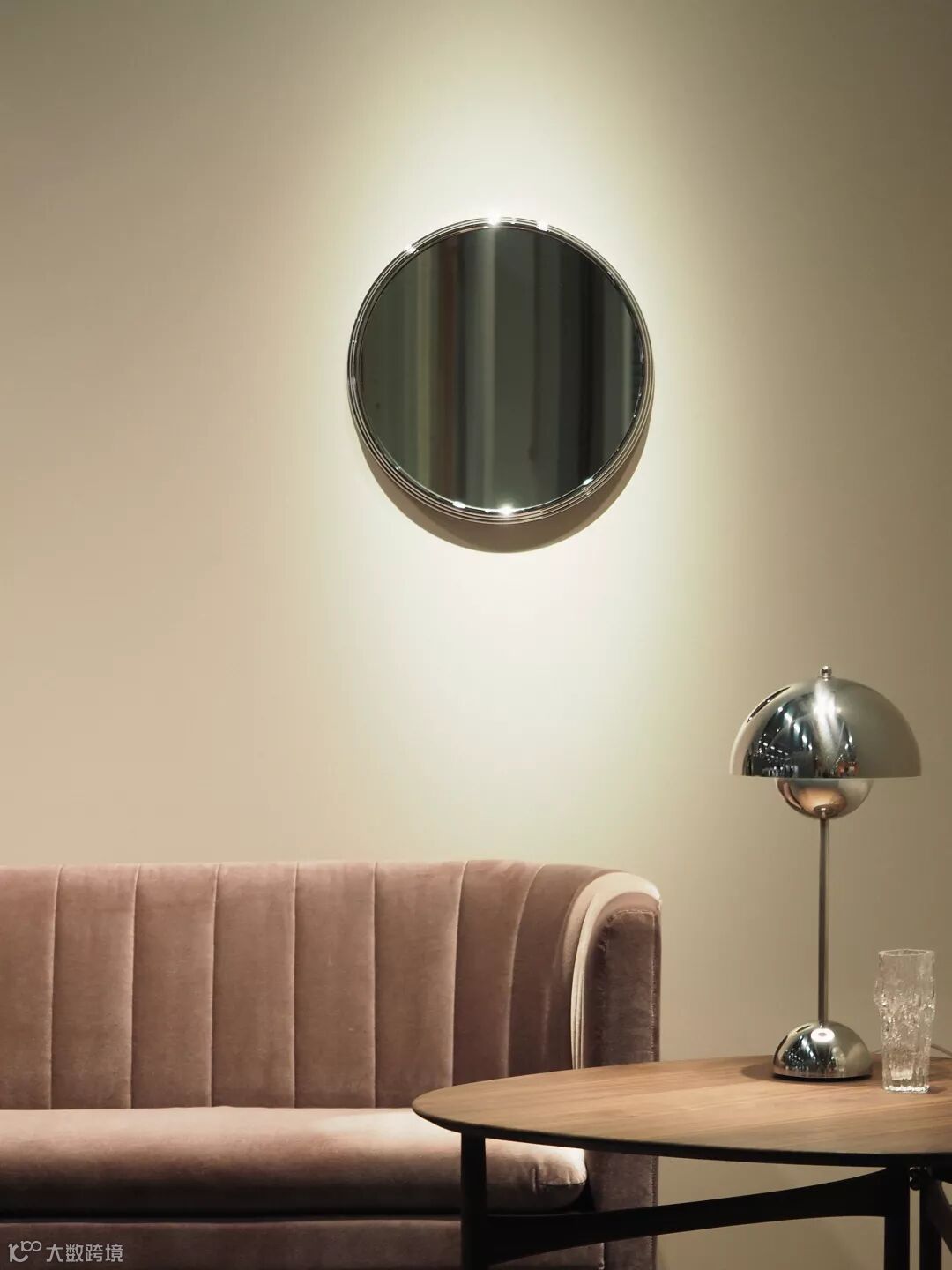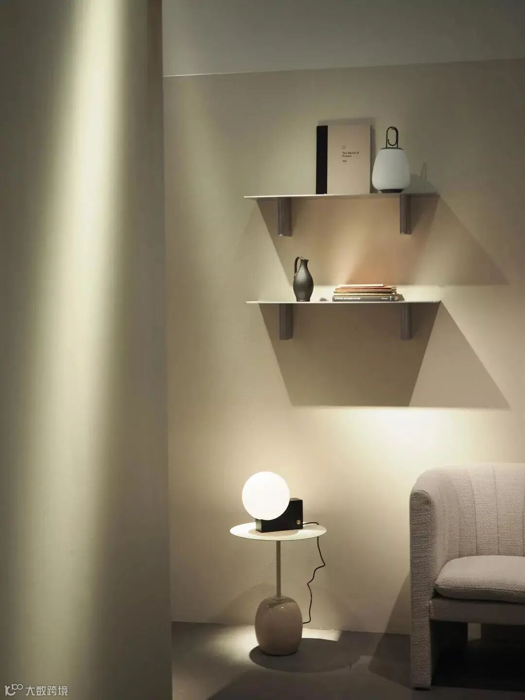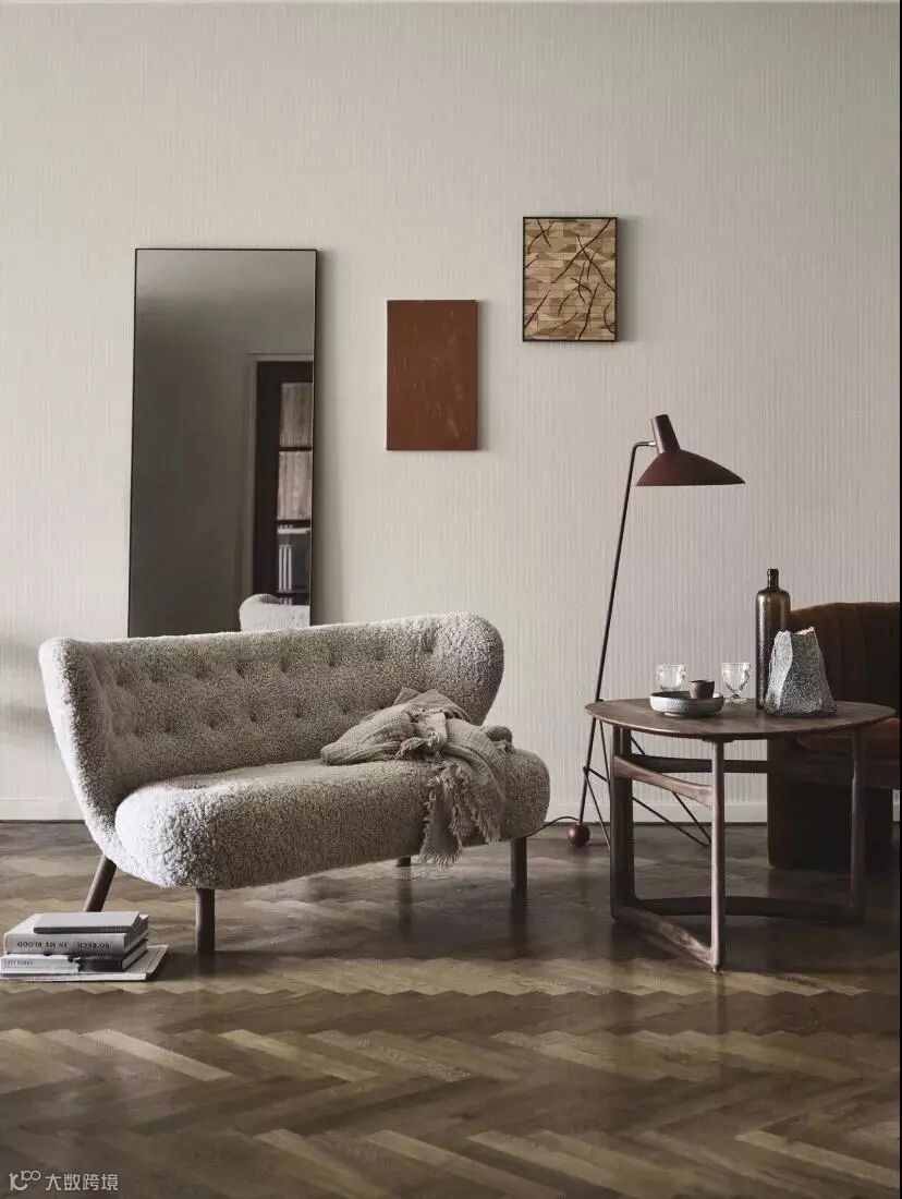最后,沙发边上的 Drop Leaf 系列茶几与同系列餐桌一样,让人惊喜不断,折叠后甚至可以挂壁收纳。而不常见的银色亮面 Flowerpot 台灯与 Sillon 圆镜,搭配冷色系面料的 Loafer 双人沙发,更给人有别以往的视觉体验。