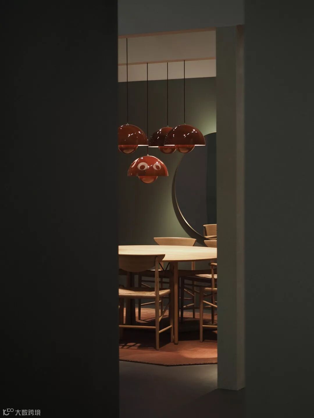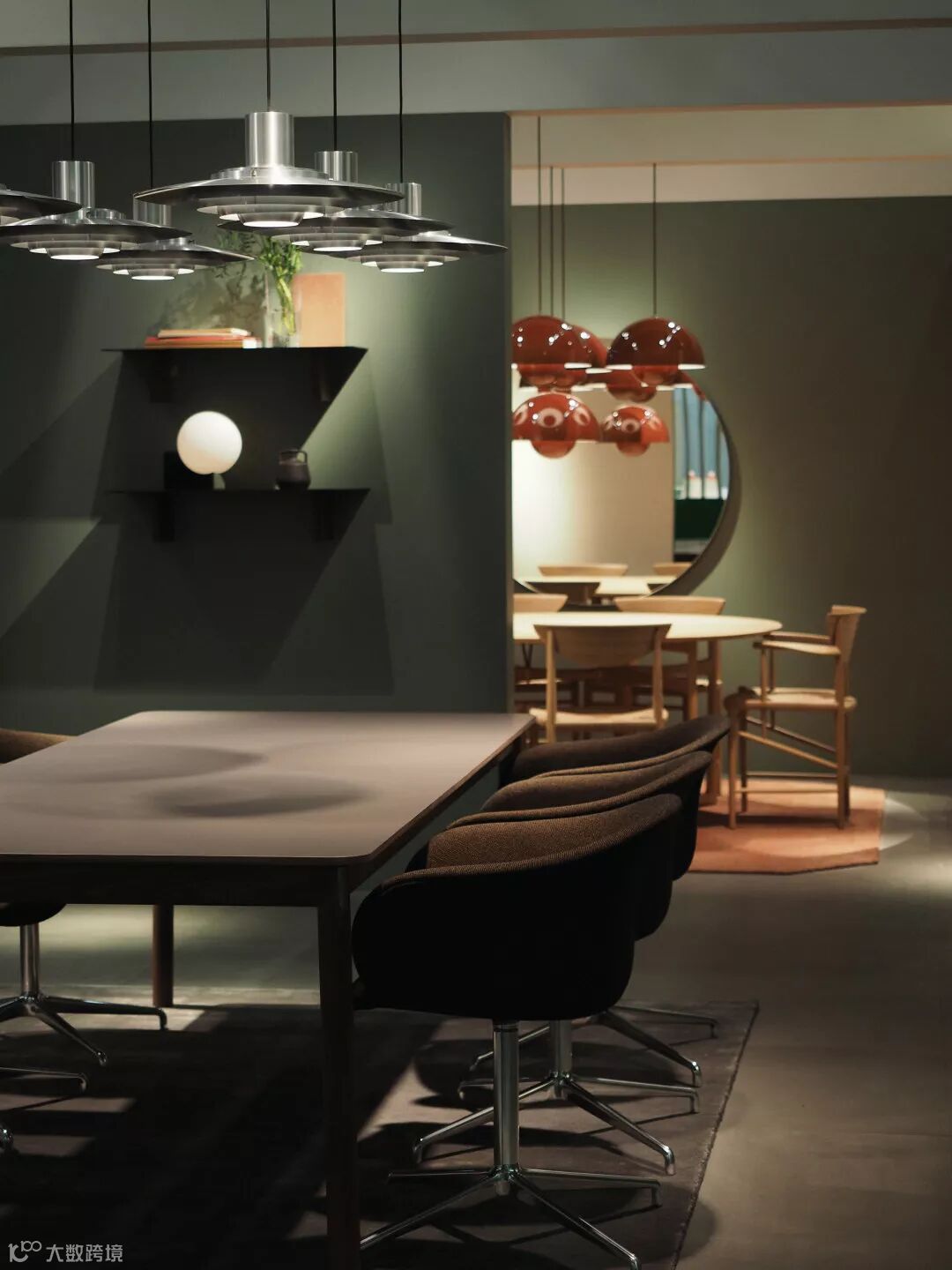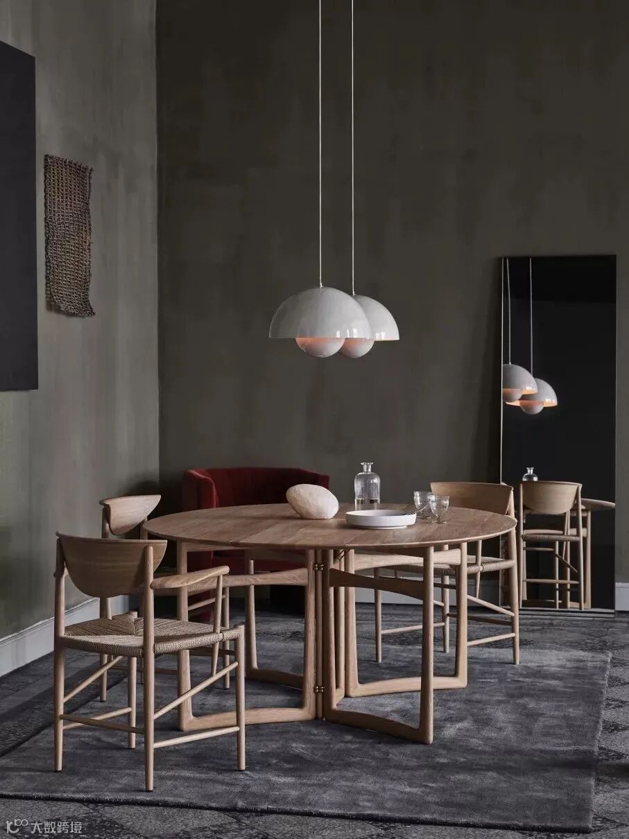 另一边,餐厅区域一组醒目的 Flowerpot 吊灯下方,同样来自丹麦设计先驱 Hvidt & Mølgaard 创作的多功能餐桌 Drop Leaf 和传统木质座椅 Drawn,可以为任何空间带来舒适的朴实感。