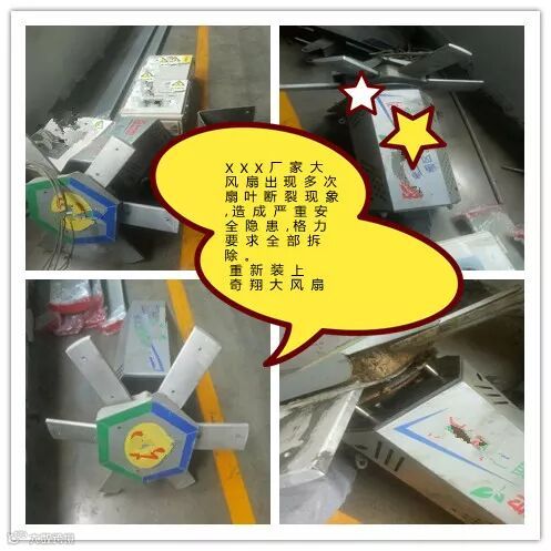 超大工业风扇,由于其产品处于新兴阶段,没有相关国家、行业的标准,供应商品质参差不齐;导致珠海格力电器公司在前期采购了某品牌50多台超大风扇中,连续8次 发生扇叶断裂等安全事故, 危及人身、财物安全,可见,选择一盏安全放心的超大吊扇多么重要!